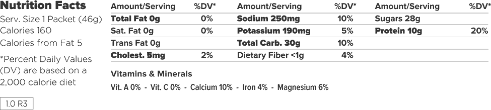 Organic Glucose, Organic Dried Cane Syrup, Whey Protein Isolate, Milk Protein Concentrate, Organic Alkalized Cocoa Powder, Natural Flavors, Sea Salt, Soy Lecithin, Calcium Citrate, Magnesium Citrate, Potassium Citrate.