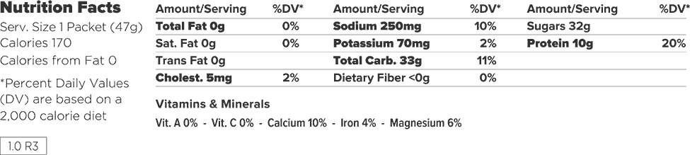Organic Glucose, Organic Dried Cane Syrup, Whey Protein Isolate, Milk Protein Concentrate, Citric Acid, Natural Flavors, Sea Salt, Soy Lecithin, Colored with Annatto, Calcium Citrate, Magnesium Citrate, Potassium Citrate.