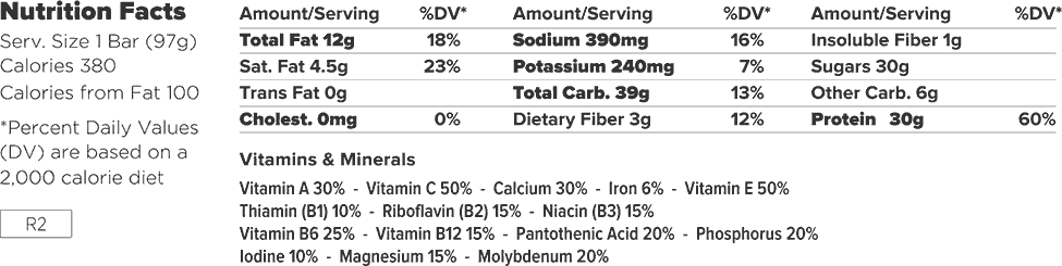 TriBuild™ Protein Blend (Soy Protein Isolate, Soy Protein Rice Crisps [Soy Protein Isolate, Rice Starch], Soy Protein Concentrate, Whey Protein Isolate, Casein), Organic Cane Syrup, Coating (Organic Dried Cane Syrup, Palm Kernel Oil, Cocoa, Soy Protein Isolate, Soy Lecithin, Vanilla Extract), Organic Chocolate Chips (Organic Cane Sugar, Organic Chocolate Liquor, Organic Cocoa Butter, Organic Soy Lecithin, Organic Vanilla Extract), Cashew Butter, Natural Flavors, Organic Sunflower Oil, Organic Brown Rice Syrup, Vegetable Glycerin, Inulin Syrup (Chicory Root Extract), Organic Alkalized Cocoa, Cocoa Powder, Sea Salt, Soy Lecithin.
