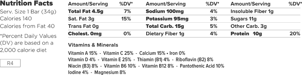 Soy Protein Isolate, Beet Juice Concentrate, Organic Brown Rice Syrup, Organic Dried Cane Syrup, Palm Kernel Oil, Unsweetened Chocolate, Organic Rolled Oats, Cocoa, Organic Soy Protein Concentrate, Organic Sunflower Oil, Vegetable Glycerin, Natural Flavors, Organic Almonds, Rice Starch, Cane Syrup, Inulin (Chicory Extract), Cocoa Butter, Organic Flaxmeal, Organic Oat Fiber, Soy Lecithin, Salt, Colored with Beet Powder.