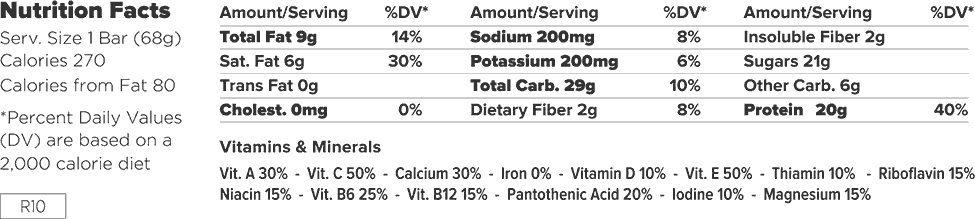 Soy Protein Isolate, Beet Juice Concentrate, Organic Brown Rice Syrup, Organic Evaporated Cane Juice, Palm Kernel Oil, Organic Rolled Oats, Unsweetened Chocolate, Cocoa, Organic Soy Protein Concentrate, Vegetable Glycerin, Natural Flavors, Organic Dry Roasted Almonds, Rice Starch, Cocoa Butter, Inulin (Chicory Extract), Organic Milled Flaxseed, Organic Oat Fiber, Organic Sunflower Oil, Soy Lecithin, Salt.
