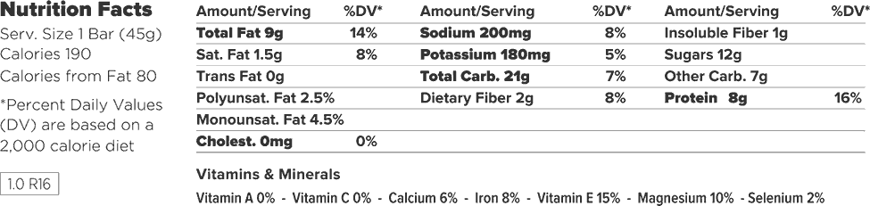 Organic Brown Rice Syrup, Organic Dry Roasted Peanuts, Organic Raisins, Dry Roasted Almonds, Soy Rice Crisps (Soy Protein Isolate, Organic Rice Flour, Calcium Carbonate), Organic Chocolate Chips (Organic Evaporated Cane Juice, Organic Unsweetened Chocolate, Organic Cocoa Butter, Soy Lecithin, Natural Flavors), Organic Pretzels (Organic Wheat Flour, Salt, Organic Canola Oil, Organic Malt), Organic Peanut Butter, Organic Dry Roasted Soybeans, Dry Roasted Pumpkin Seeds, Sunflower Seeds, Sunflower Oil, Roasted Sunflower Kernels, Organic Oat Syrup, Vegetable Glycerin, Organic Sunflower Oil, Sea Salt, Organic Gum Arabic, Natural Vitamin E (antioxidant).
