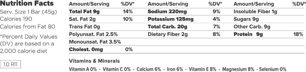 Organic Brown Rice Syrup, Organic Dry Roasted Peanuts, Soy Rice Crisps (Soy Protein Isolate, Organic Rice Flour, Calcium Carbonate), Peanut Butter Filled Pretzels (Enriched Wheat Flour [Niacin, Reduced Iron, Thiamine Mononitrate, Riboflavin, Folic Acid], Peanut Butter, Salt, Baking Soda), Peanut Butter Chips (Evaporated Cane Juice, Palm Kernel Oil, Peanut Flour, Soy Lecithin), Organic Pretzels (Organic Wheat Flour, Salt, Organic Malt Syrup, Organic Canola Oil, Yeast, Baking Soda), Organic Peanut Butter, Organic Dry Roasted Soybeans, Organic Oat Syrup, Vegetable Glycerin, Peanut Flour, Organic Sunflower Oil, Roasted Peanut Extract, Sea Salt, Organic Gum Arabic, Natural Vitamin E (antioxidant).