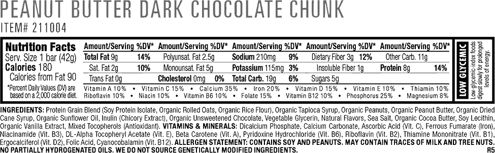 Protein Grain Blend (Soy Protein Isolate, Organic Rolled Oats, Organic Rice Flour), Organic Tapioca Syrup, Organic Peanuts, Organic Peanut Butter, Organic Dried Cane Syrup, Organic Sunflower Oil, Inulin (Chicory Extract), Organic Unsweetened Chocolate, Vegetable Glycerin, Natural Flavors, Sea Salt, Organic Cocoa Butter, Soy Lecithin, Organic Vanilla Extract, Mixed Tocopherols (Antioxidant).