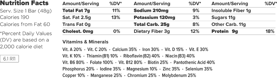 LunaPro® (Soy Rice Crisps [Soy Protein Isolate, Organic Rice Flour, Calcium Carbonate], Organic Toasted Oats [Organic Rolled Oats, Organic Dried Cane Syrup, Natural Vitamin E (Antioxidant)], Organic Roasted Soybeans, Organic Soy Flour, Organic Flaxseed), Organic Brown Rice Syrup, Organic Coating (Organic Dried Cane Syrup, Organic Palm Kernel Solids, Organic Soy Flour, Organic Soy Lecithin, Organic Vanilla Extract), Inulin (Chicory Extract), Macadamia Nuts, Macadamia Nut Butter, Organic Cashews, Organic Tapioca Syrup Solids, Organic Sunflower Oil, Vegetable Glycerine, Sea Salt, Natural Flavors, Organic Natural Flavor, Natural Vitamin E (Antioxidant).